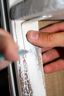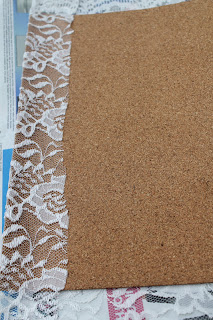 lace. I used my bottle of fabric glue as a rolling pin to flatten my fabric to the corkboard. Attach your burlap on the other piece of corkboard.