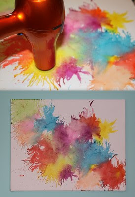 fork and hold it over your selected area. Turn on your hairdryer directly above your crayon until the crayon melts and begins splattering. You can do as little or as much of this part as you’d like! Repeat with all your colors all over your canvas. Be careful about mixing certain colors that may yield brown!